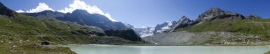 An meinem letzten Tag im Val d´Anniviers habe ich stundenlang am Gletschersee Lac de Chateaupre gesessen und Aquarelle gemalt. Dabei konnte ich gut beobachten, wie der leicht gefrorene See allmählich auftaute und sein Spiegelbild der Umgebung freigab. So entstand in mir Idee dieses etwas ungewöhnliche Panorama zu fotografieren.