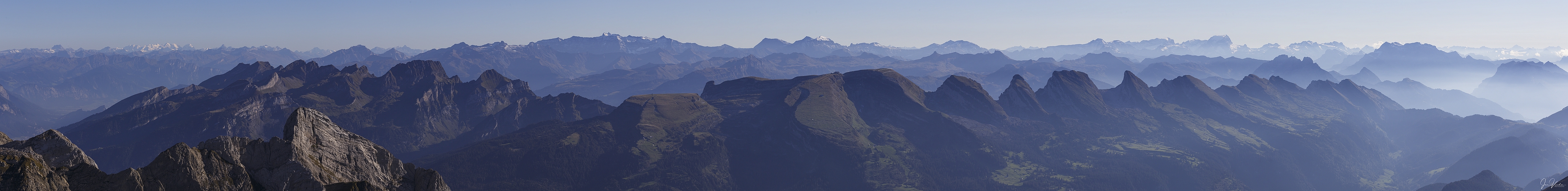 Diesen Schwenk über die sieben Churfürsten habe ich im Herbst 2021 auf dem Gipfel des Säntis aufgenommen. Es war schon spät am Nachmittag, was den Fotobedingungen natürlich zu Gute kam. 13 QF Aufnahmen mit EOS 5D M3 á 100mm, f13, 1/320s, ISO100, 17:05 Uhr, PTGui Pro