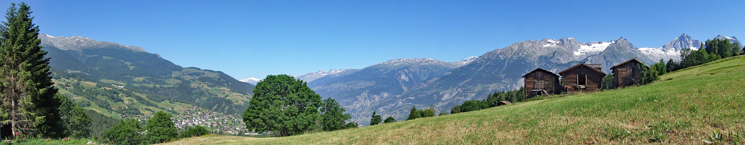 ...mit typ. Heustadeln, tourist. erschlossenen Dörfern, Weitblick Rhonetal-abwärts und stolzen Bergmassiven...