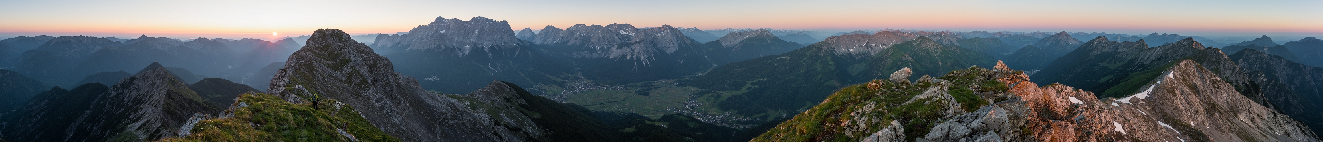 Unterwegs mussten wir aufpassen, nicht über die vielen anderen Biwakierer am Weg zu stolpern. Auch am Danielgipfel schliefen mindestens zehn Leute. Mehr los auf den Bergen rund um Lermoos, Ehrwald und Biberwier dürfte das ganze Jahr über nicht sein. Schön war´s trotzdem, und per Zufall begegnete ich auf der Upsspitze noch einem mir bereits bekannten Fotografen. Wir hatten uns das erste Mal 2014 auf dem Gamsjoch im Karwendel getroffen, natürlich auch schon zum Sonnenaufgang :-D Aufgenomme mit einer Sony Alpha 6500, Brennweite 20 (30)mm, 11 Querformat-Einzelbilder.