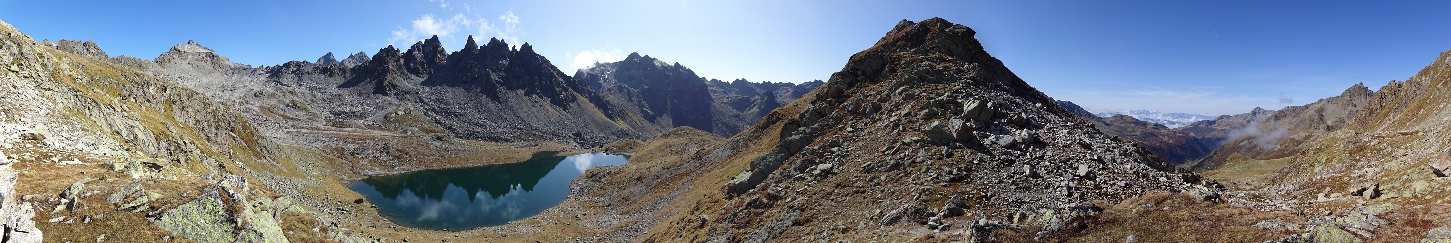 Die nächste Etappe durch die westliche Silvretta führte uns auf Empfehlung des Hüttenwirtes Tim von der Tübinger Hütte im ständigen Auf und Ab über mehrere Pässe auf der Schweizer Seite entlang. Und Tim hatte nicht zu viel versprochen, die Landschaft hier ist tatsächlich sehr abwechslungsreich. Der zweite Pass, die Schaftällifurgga, lud uns zu einer ausgiebigen Mittagspause ein und der Blick ließ wenig Wünsche offen. Nach Osten die Zackenspiegelung im azurblauen Hüenersee, nach Westen die Glarner Alpen über dem Schlappintal.