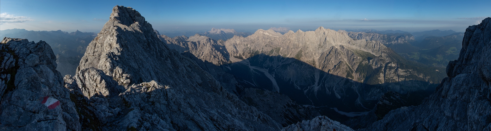 Nach kurzer Rast am Hocheck beginnt für den Aspiranten der Watzmann-Überschreitung nun der anspruchsvolle Teil der Tour - wenn man nicht als alpiner Trailrunner geboren ist, dauert der dann auch ganz schön lang.... Besonders beeindruckt hat mich an diesem frühen Morgen der Tiefblick ins Wimbachtal, das darüber himmelhoch aufragende Hochkalter-Massiv und der Schattenwurf des Watzmann-Grates, der erahnen lässt, dass es noch weit bis zur Südspitze ist :-)