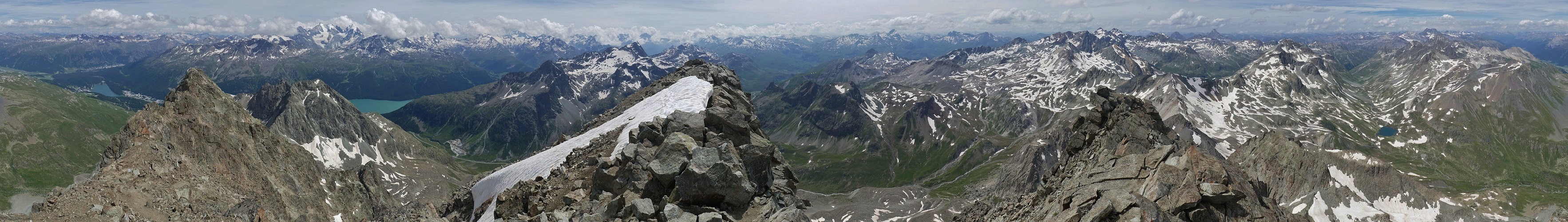 Nach einer Woche Dauerblaugrau am Comer See ist uns klar: Wir müssen da raus. Da die Straßen tagsüber verstopft sind und der Weg weit und anstrengend werden würde, schwingen wir uns halb 4 aufs Rad. Halb 6 passieren wir in Castasegna unerkannt die Schweizer Grenze, schrauben uns durch´s Bergell beständig aufwärts und erreichen halb 9 den Malojapass. Vor uns liegt kühl und klar das Engadin. Aber wir wollen mehr. Dafür müssen wir nun noch die abgas- und lärmkontaminierte Passstraße von Silvaplana zum Julierpass aushalten. An der Chamanna dal Stradin lassen wir um 10 unsere Fluchtfahrzeuge zurück und unterscheiden uns von den anderen Gipfelstürmern nur noch dadurch, dass uns auf der zweistündigen Kraxelei von der Fuorcla Albana über den Ostgrat alle anderen bereits entgegen kommen. Um drei erreichen wir als Letzte den Gipfel, bezahlen unsere Bummelei mit vielen Quellwolken, haben den Moment dafür aber ganz für uns allein. Aus Respekt vor dem Trittsicherheit erfordernden Gratabstieg machen wir uns nach einer halben Stunde schon wieder auf den Heimweg, obwohl uns nach einer längeren Pause zumute gewesen wäre. Im letzten Tageslicht sind wir zurück in der Auspuffkette an den dunstigen lombardischen Seen.