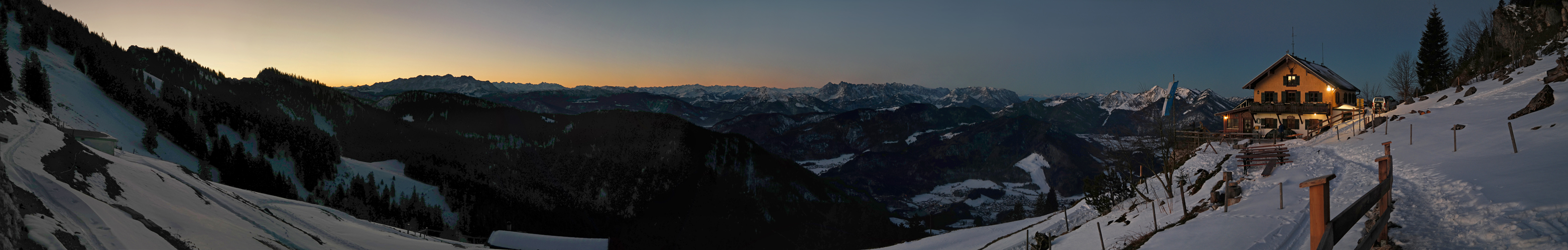 Auch wenn die Sonne um diese Jahreszeit erst gegen 8 Uhr aufgeht, so habe ich es mir trotzdem verkniffen, zum Sonnenaufgang auf den Gipfel zu steigen, zumal das Hochgernhaus selber ja auch schon eine erstklassige Aussichtskanzel ist. Also Fenster auf und los geht's, zumal die Morgen- und Abenddämmerung jeweils die schönsten Farben liefern.