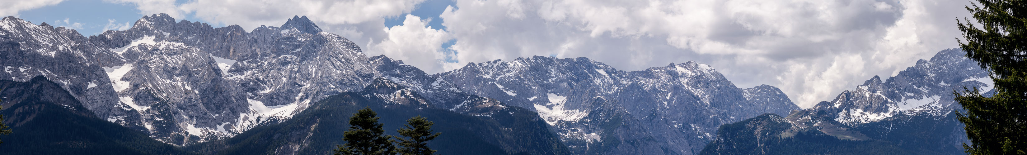 Interessant, dass es hier noch kein Panorama von diesem Mini-Berg über Elmau zwischen den Riesen gibt. Der Bergrücken hat den gleichen Namen, wie das nördlich unterhalb gelegene Dorf. 6 QF, 105 mm. Der Gipfel selbst ist stark bewaldet, aber nach Süden hin gibt's eine Lücke. Und etwas weiter westlich eine Freie Fläche mit schönem Blick auf Wetterstein und Zugspitze.