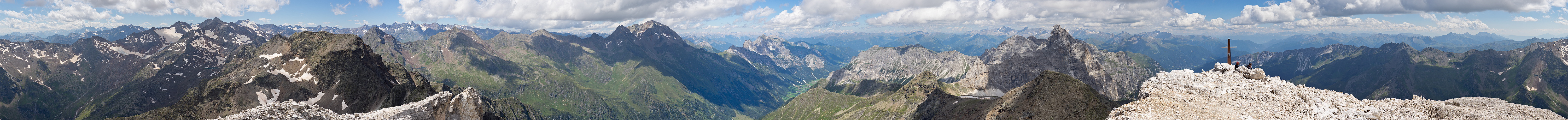 Angesichts der Tatsache, dass der Abstieg zur Hütte nicht allzu weit ist, habe ich erstmal abgewartet und sicherlich einen Rekord in der Diziplin "Längster Gipfelaufenthalt auf der Weißwandspitze" aufgestellt. Es wurde dann tatsächlich besser, aber die Sichtverhätnisse, die Christoph hier 2012 erlebt oder die ich am frühen Morgen evtl. gehabt hätte, stellten sich nicht ein. Das Panorama zeige ich trotzdem, denn seit Christophs Besuch gibt es auf der Weißwandspitze ein neues Gipfelkreuz.