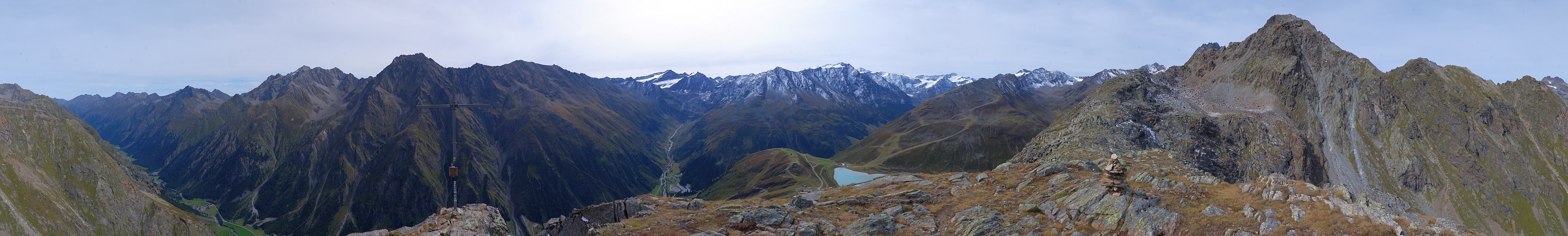 Der Brandkogel ist in gut einer Stunde vom Riffelsee aus erreichbar, fordert aber etwas Übung im steilen Gelände, wobei es keine Sicherungen gibt. Das Wetter wurde vom Tief über dem Golf von Genua bestimmt, deshalb hatte es gedämpftes Licht aber gute Frensicht.