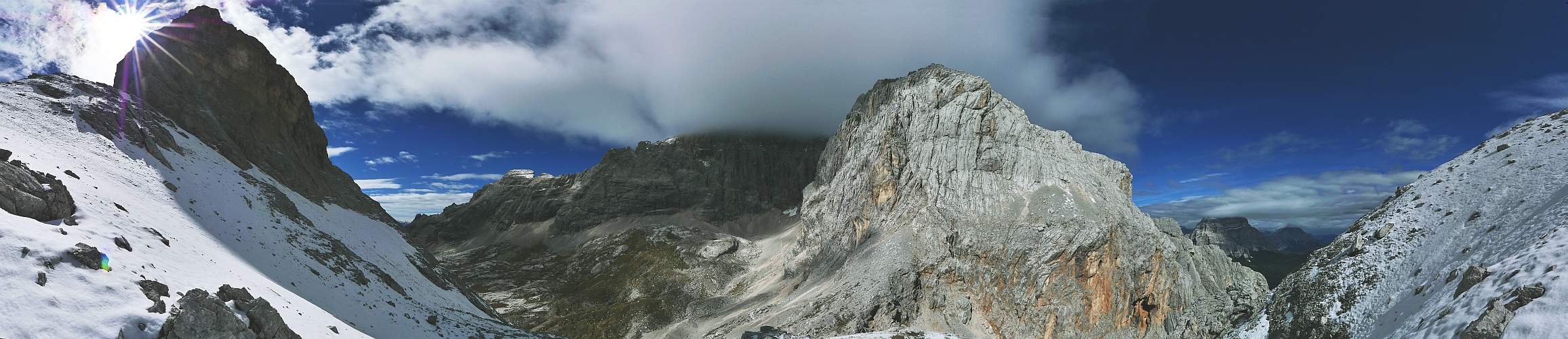 Forse posterò altre foto, con nuvole per me molto belle, anche se non mi sembrano gradite più di tanto. Ma ormai la cosa mi interessa meno di zero; prendo questo sito esclusivamente come un archivio personale delle mie panoramiche, pur continuando ad apprezzare molto le panoramiche degli altri. Il Van delle Sasse è uno spettacolo naturale incredibile; ho ricordi di gioventù - tanta gioventù, sedici/diciassette anni... - della traversata da malga Pioda a Listolade passando per il Coldai e poi lungo il Tivan e il Van delle Sasse in piena estate con un mucchio di neve risalendo la Forcella delle Sasse. Sei mai stato al bivacco Grisetti?