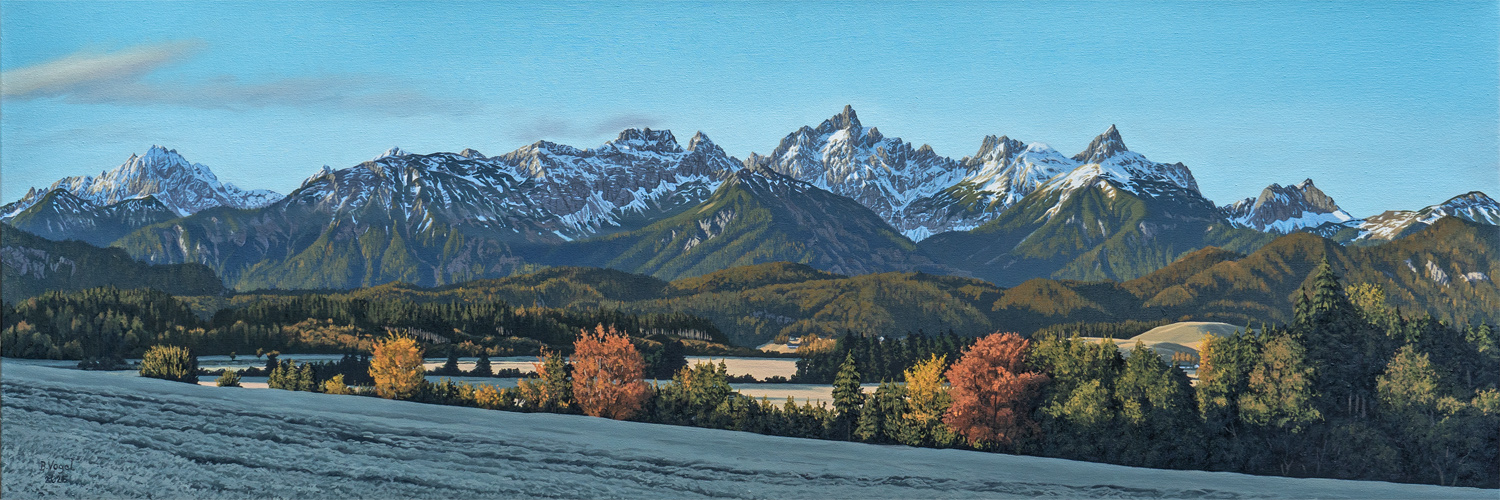 2020 habe ich meinen Herbsturlaub in Eschach verbracht. Dort entstand die künstlerische Idee besonders lieb gewonnenen Berglandschaften meinen fiktiven Stempel aufzudrücken. Nun ist das gemalte Panorama meines Blicks vom Ferienwohnungs-Balkon fertig gestellt und zeigt die beeindruckende Kulisse des Ostallgäus um die Tannheimer Spitze.