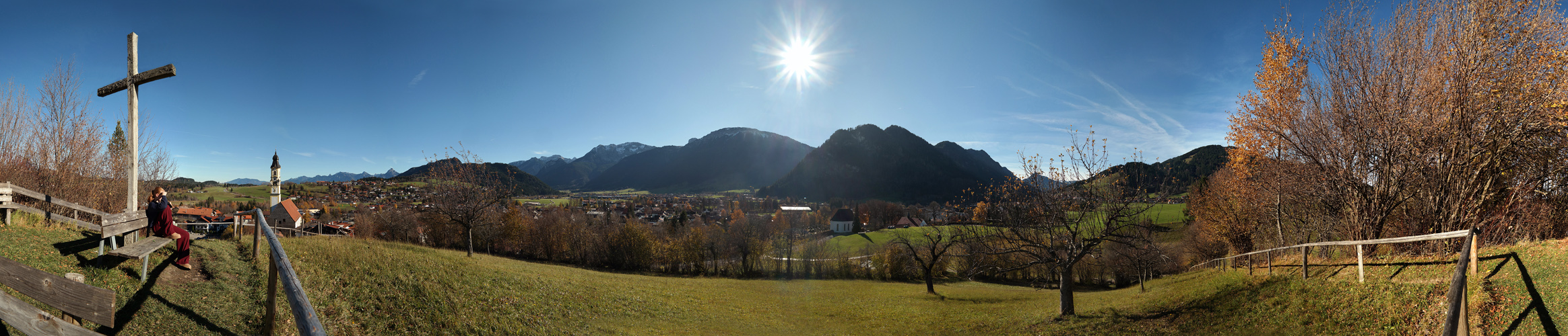 Ein kurzer Aufenthalt im Allgäu, Bilderbuchwetter und nur ein begrenztes Zeitlimit. Wohin zum Panoramisieren? Nah und zentral ist der kleine Hügel westlich der Pfarrkirche.