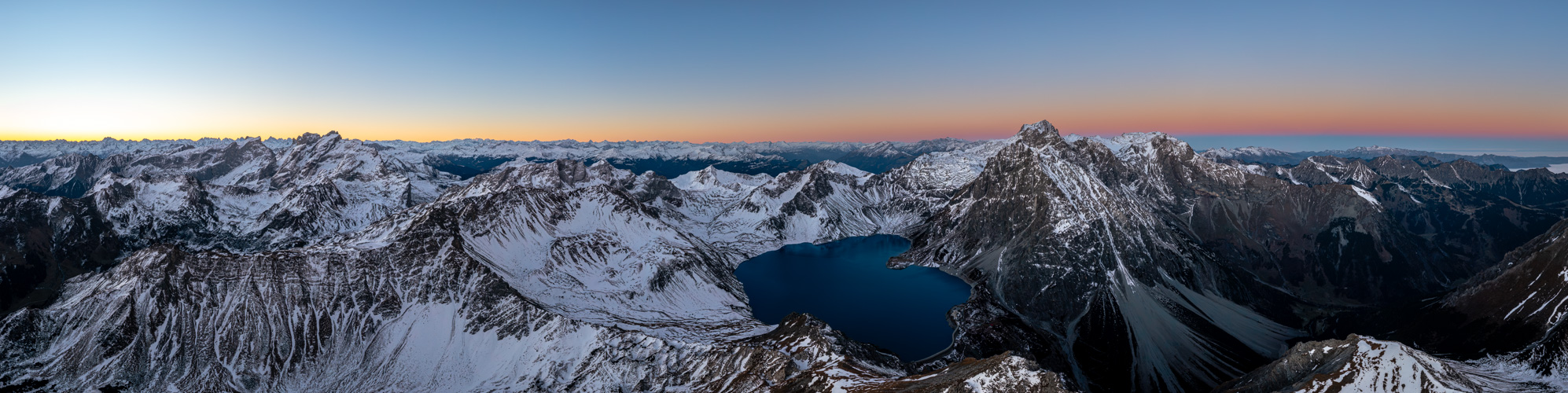 Eine Drohnenaufnahme aus dem Rätikon mit dem Lünersee als zentralem Blickfang. Im Sommer ist die Gegend mit Auto und Bahn relativ leicht erreichbar. Ab dem Herbst wird es deutlich aufwendiger, da sowohl die Straße zum Parkplatz der Lünerseebahn als auch die Bahn selbst außer Betrieb sind. Deshalb habe ich mich für eine Biwaknacht entschieden und konnte am Morgen vom Gipfel des Schafgafall sowohl mit Kamera als auch mit der Drohne mehrere Aufnahmen realisieren.