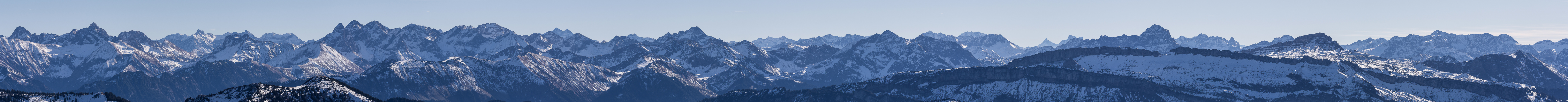 Ein weiteres Panorama aus der "November-beste-Sicht-Serie", diesmal vom Rindalphorn gegen 14.00 Uhr nach Süden bei 200mm APSC, ISO 100. 25x freihand. Interessant ist, wie sich die Berge am Horizont zwischen Hochgrat-Aussicht und Rindalphorn-Aussicht doch deutlicher verschieben, als gedacht. So lugt z.B. der Piz Buin in 74 km Entfernung, von hier aus betrachtet, deutlich hervor!