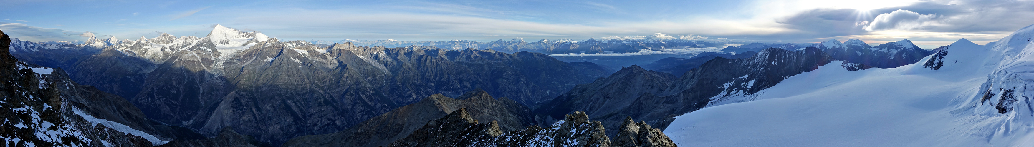 Anfang August, bei unserem Versuch den Nadelgrat von der Bordierhütte aus zu überschreiten, war die angekündigte Schönwetterphase noch nicht ganz angekommen. Bei den ohnehin noch etwas winterlichen Bedingungen trübte es sich an diesem Tag schon früh morgens ein. Wir hatten da gerade den ersten Gipfel des Nadelgrats erreicht, das Chli Dirruhorn, was für uns somit schließlich der Umkehrpunkt wurde. Auch bis hierher war es allerdings schon eine ausgewachsene Tour gewesen, waren wir doch bereits fünf Stunden unterwegs – vergebens war es bei diesem Panorama aber keinesfalls.. :-)