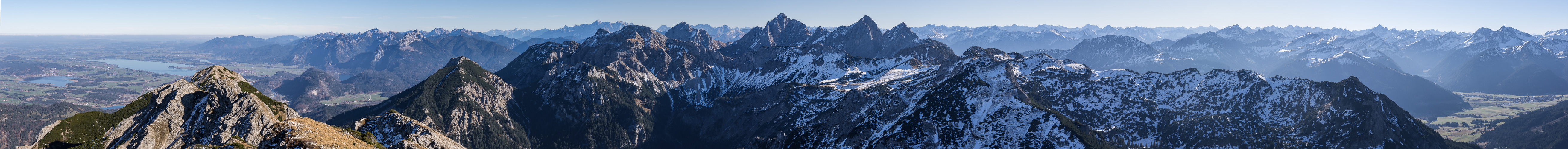 Wie Panorama Nr. 42290. Allerdings diesmal mit den Tannheimer Bergen im Zentrum und eingerahmt von der Seenlandschaft des Alpenvorlands sowie des Tannheimer Beckens.