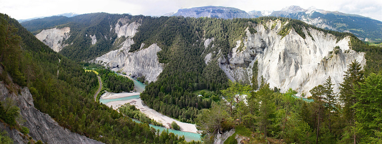 wo man ungehindert mehrere grosse Mäander des Vorderrheins nacheinander überblicken kann. Freihandpano aus 6 HF-Aufnahmen mit f/8, 1/160s, 200 ISO, 30mm (KB) Blickwinkel ca. 125° Richtung NNW (Mitte des Panos)