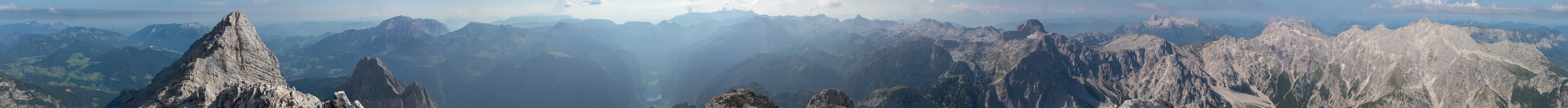 In der Trilogie der Watzmann-Gipfel bin ich noch die dunstige Rundumsicht von der Südspitze schuldig geblieben, wo wir uns (wie alle anderen Bergsteiger) physisch und mental auf den noch langen und anspruchsvollen Abstieg ins Wimbachtal vorbereiten. Wenig später, als wir noch im steileren Gelände beim Abklettern waren, folgte auch schon der erste Einsatz des Rettungshubschraubers weiter unten, der mehrmals in die Felsen anfliegen musste, um einen Verletzten zu bergen.