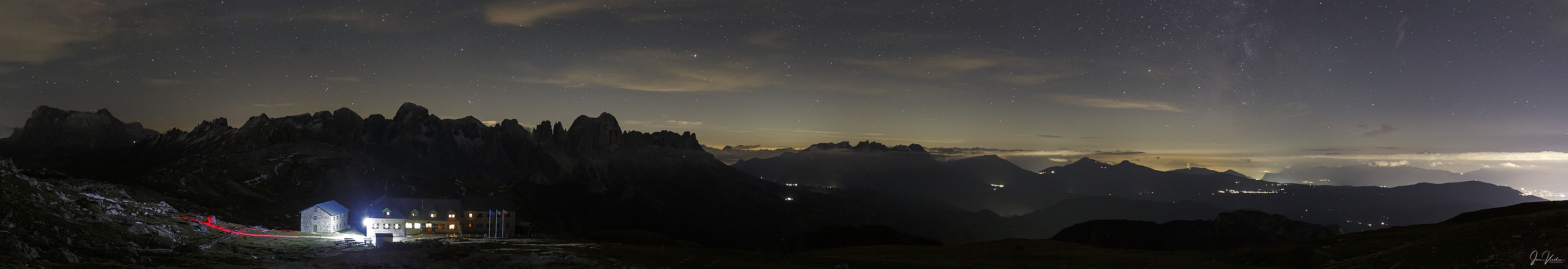 Während ich in angenehmer Stille die Sterne am Himmel über den Dolomiten beobachtete, stapfte doch tatsächlich noch jemand mit roter Stirnlampe um das Schlernhaus. Im Nachhinein eigentlich gar nicht übel, erkennt man somit mit der gewählten langen Belichtung gleich etwas mehr vom dunklen Vordergrund.
