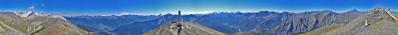 Auf der Höhe des Strickbergs 2.553m überm Hochpustertal bei Sonnenaufgang. Schwierige Hell-Dunkel-Verhältnisse, aber (m.E.) starker Eindruck in völliger Berg-Einsamkeit. Analoge Aufnahme mit Seitz Roundshot 35. Mit diesem Profigerät wird ein KB-Film an einem regulierbaren Schlitz vorbeigeführt, wobei sich die Kamera dreht. In diesem Fall 5 Viertel. Daher ist das Gipfelkreuz 2mal zu sehen. Womit sich der Vollkreis sichtbar schließt. Es gibt keine Zeit-/Blenden-/Entfernungs-Einstellung. Die Belichtung wird durch Veränderung des Schlitzes reguliert.. Die Lienzer Dolomiten im Osten (links´vom Kreuz) sind beim Motorstart der Kamera nicht so scharf abgebildet wie ganz rechts vorm Motorstop. Im Süden die Pustertal-Berge und die Dolomiten. Später der Alpenhauptkamm mit Großglockner und rechts die Grenzberge Südtirol/Osttirol in starkem Gegenlicht. Man erkennt schwach im Dunkel die Fronten der ehemaligen Grenzer-Hütten. Überm Pustertal wabert Nebel wie ein Fluss, magisch beleuchtet. P.S.: Es war bei Sonnenaufgang trotz Sonne mit ihren strahlenden Herbst-Farbtönen nur ca. 4°C „warm“.