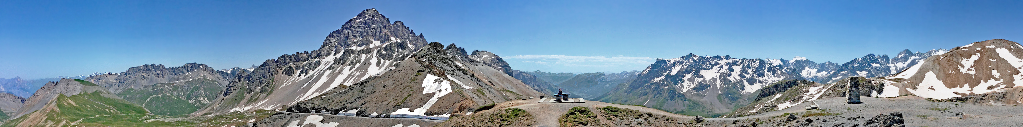 Der ursprüngliche Pass (1876) lag übrigens ca. 16 m über dem heutigen Einschnitt, auf 2658 m, vermutlich nahe dem Steinmonument. Der Ausblick ist berauschend: Im Norden die Berge überm Maurienne-Tal (Modane), im trockeneren Süden die Ecrins-Gruppe, die höchste im südlichen Frankreich (Barre des Ecrins 4.102 m, im Pano ist die vergletscherte Nordfront sichtbar). Stark auch der Grand Galibier östlich gegenüber. Er steht überm Guisane-Tal, durch das die Route des Grandes Alpes vom Galibier via Lautaret nach Briancon führt. Höchste Stadt Frankreichs. 1.326m. Zwar hier nur am Rande, aber auch ein Highlight: die Gipfel der Meije , rechts. Es lohnt sich also, mal mitten im Pano zu stehen... Aufnahme mit ipad air2 31mm. Im Orig. 32 MP 13 MB. Ich denke, für die kleine Objektivgröße ist die Qualität durchaus ansehnlich. Nachtrag: Im nicht verkleinerten Orig-Bild erkennt man, dass nicht e i n Männlein im Pano steht, sondern deren 2.