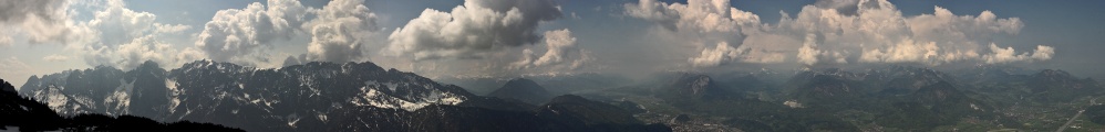 Wilder Kaiser (Nordseite) und das Unterinntal mit den Brandenberger Alpen und den Bayerischen Voralpen westlich des Inns.