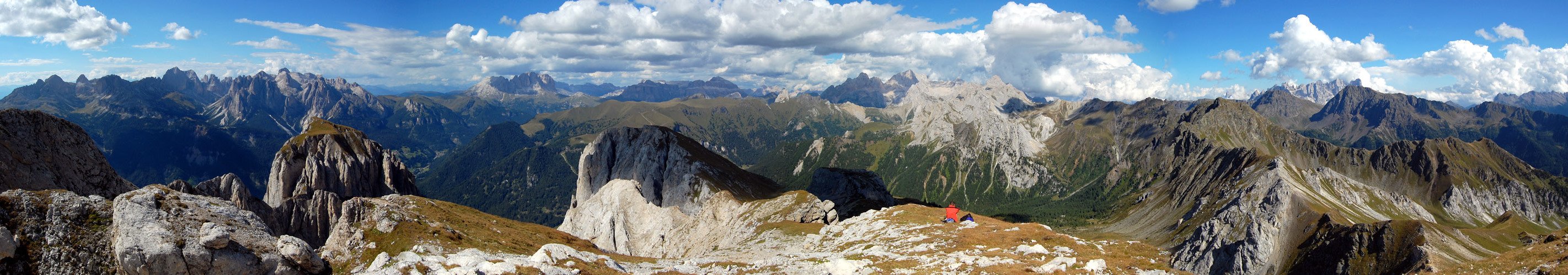 Hoch über dem Fassatal erhebt sich die Punta Vallaccia als westlicher Eckpfeiler des Monzonikamms. Wechselnde Gesteinsarten schaffen hier mal ein etwas anderes Dolomiten-Panorama...