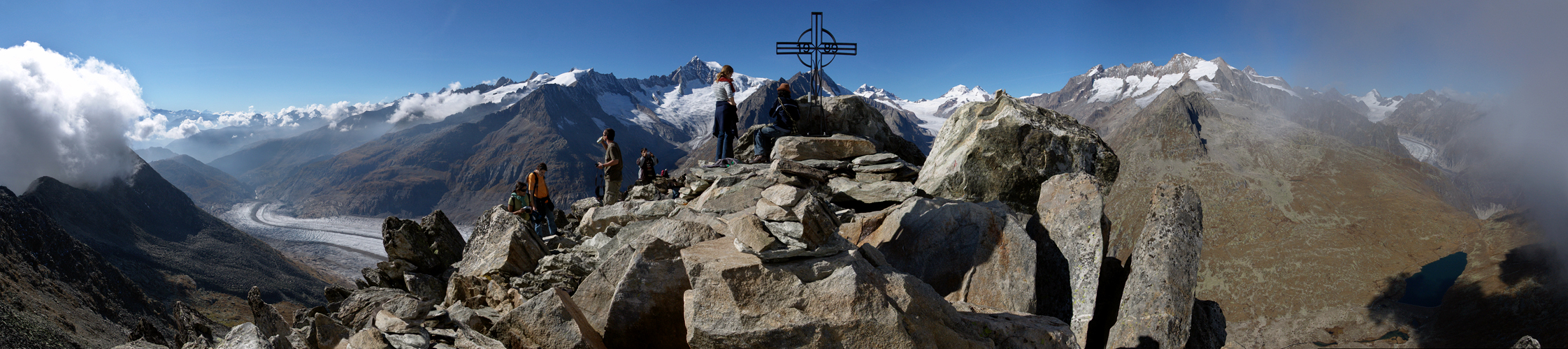 Bei der Suche nach einem Eggishornpanorama für einen Interessenten, bin ich auf meiner externen Festplatte auf dieses vermeintlich unbrauchbare Pano gestossen. Unbrauchbar deshalb weil es voller Gespenster war. Der Nachteil bei Zweireihigen. Der Mann mit dem Orangefarbigen T-Shirt war in der oberen Reihe einen Halben Meter weiter rechts. Also Oberkörper und Unterkörper versetzt. An einem andern Ort waren noch die Hosen eines Mannes zu sehen. Und einer der bei der oberen Reihe noch nicht auf dem Gipfel war, platzierte sich direkt vor mir, hinter dem Steinmann vor dem Kreuz. Dem seinen Schatten sieht man noch auf dem Stein rechts davon. Zudem musste ich noch herumliegende Rucksäcke und Windjacken mit zusätzlicher Stempelaktion versorgen. Die aufziehende Wolke hat beinahe den Blick zum Märielensee versperrt. Und, wenn ich damals bessere Kenntnis über die umliegenden Gipfel gehabt hätte, wäre mir der Eiger sicher nicht durch die Lappen gegangen.