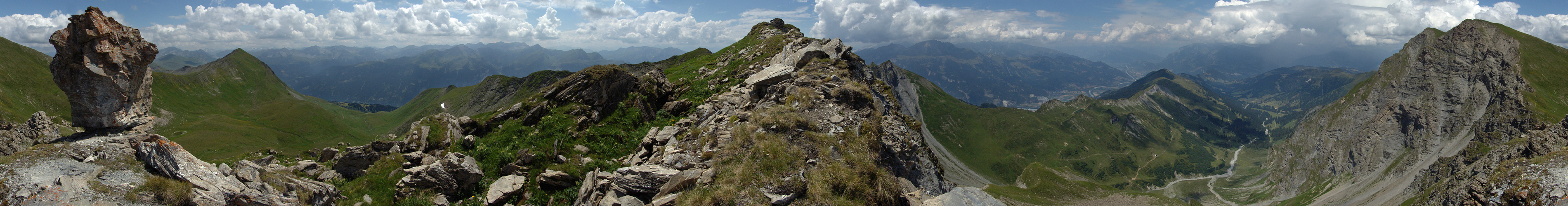 Pano aus 8 Querformataufnahmen EXIF Daten: SONY DSC-F828 23.07.2006 13:48 1/800 s - f/5.6 - ISO 64 - 7.1 mm / 28 mm Aufnahmestandort - Höhe / Koordinaten: Tüfelsch Chopf 2480 m - 766800/193388 (46.870685, 9.626748) Blickrichtung Panomitte: 267° - Öffnungswinkel: 360°