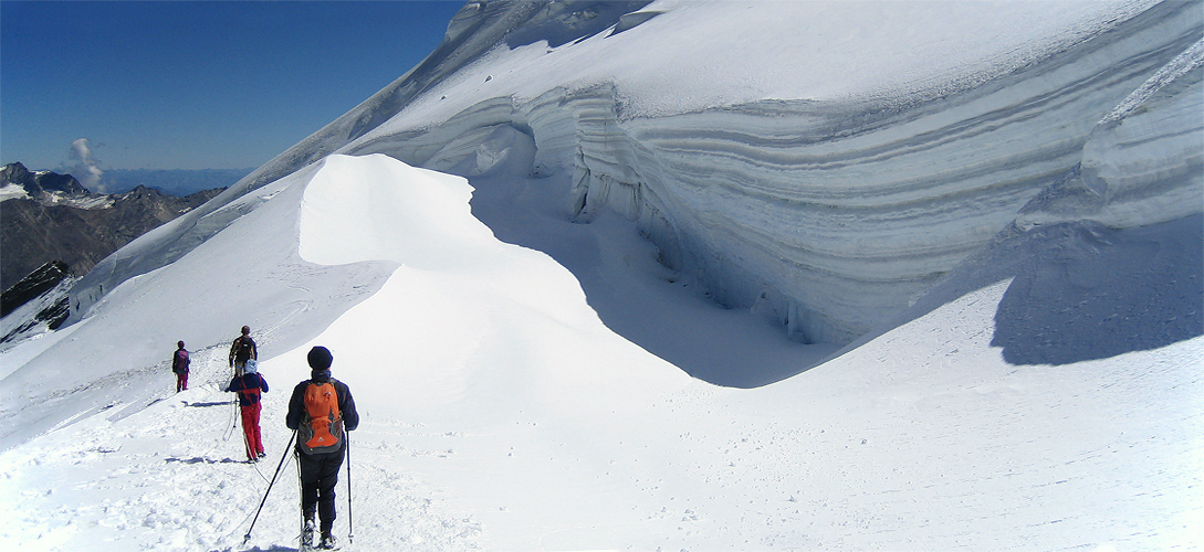Es zeigt meine Familie beim Abstieg vom 4027 m hohen Allalinhorn. Auf dem Pano 6144 (Link) ist der Standpunkt übrigens vom Mittelallalin aus zu sehen. Ich bin mir nicht ganz sicher ob es hier auf A-P richtig plaziert ist. Würde mich dazu über zahlreiche Kommentare freuen. LG Hans