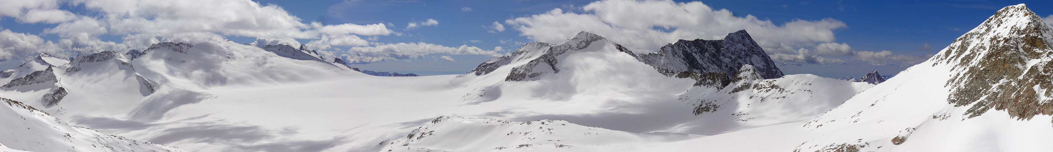 Nachdem wir den Gipfel des Monte Adamello (3539 m) bezwungen haben, steigen wir auf den Passo Venezia (3226 m) auf, um von dort fast 2000 Höhenmeter nach Ponte di Legno abzufahren. Hier bietet sich noch einmal ein wunderschönes Panorama auf das Gletschergebiet des Adamello. Die Bilder wurden um 11:45 Uhr aufgenommen.