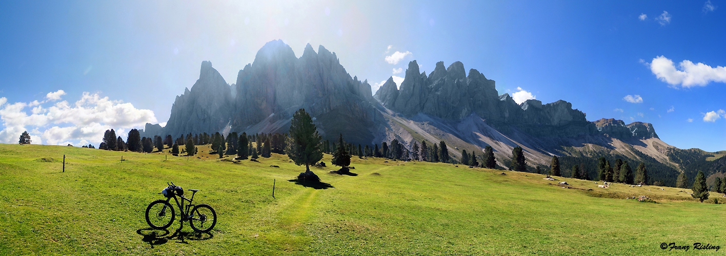 Entstanden auf der letzjährigen Radltour vom Chiemsee aus. Der Blick nähe der Gschnagenhardt-Alm auf die Nordabstürze der Geisler-Spitzen ist wahrlich traumhaft schön. Das Gegenlicht und bei meiner Fuji leider ausgeprägten Lensflares machen ein sauberes Pano leider schwierig. Zu dem Zeitpunkt war ich, ausser den Wirtsleuten der beiden Almen, der einzige auf der Hochfläche. Später bei der Brogles Alm waren es dafür dann gefühlte 10000. Auf dem schweren Trail ins Tal war ich dann wieder alleine unterwegs. Die Etappe St. Magdalena via Adolf-Munkel-Weg zur Mahlknechthütte war eins der Highlights der Tour.